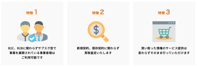 自社が保有する売掛債権を未来分まで一括で売却する資金調達手段です。最大1年間の買い取り期間および対象債権を決定し、一括での資金調達が可能です。BtoC・BtoBを問わず、サブスクリプション型ビジネスを展開している事業者が利用可能です。新規契約・既存契約を問わず買い取り査定が可能で、債権売却後も、サービス提供形式はそのままこれまで通り継続することが可能です。