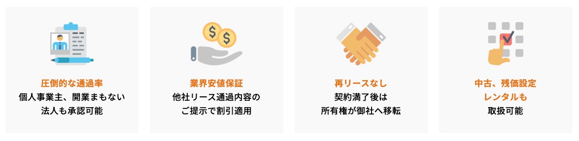 商材や設備の導入にあたり、「サブスククレジット」をご利用いただくことで、最大5年間の月額分割払いでの利用が可能です。本サービスは、高い審査通過率を誇り、個人事業主や開業間もない法人のお客様にもご利用いただけます。また、業界最安値を目指し、他社リースの審査通過内容をご提示いただければ、割引の適用も可能です。さらに、再リース不要で契約満了後、所有権は利用企業に移転します。中古製品のご利用や残価設定による柔軟なプラン設計にも対応しており、途中返却可能なレンタルサブスク形式での利用も可能です。