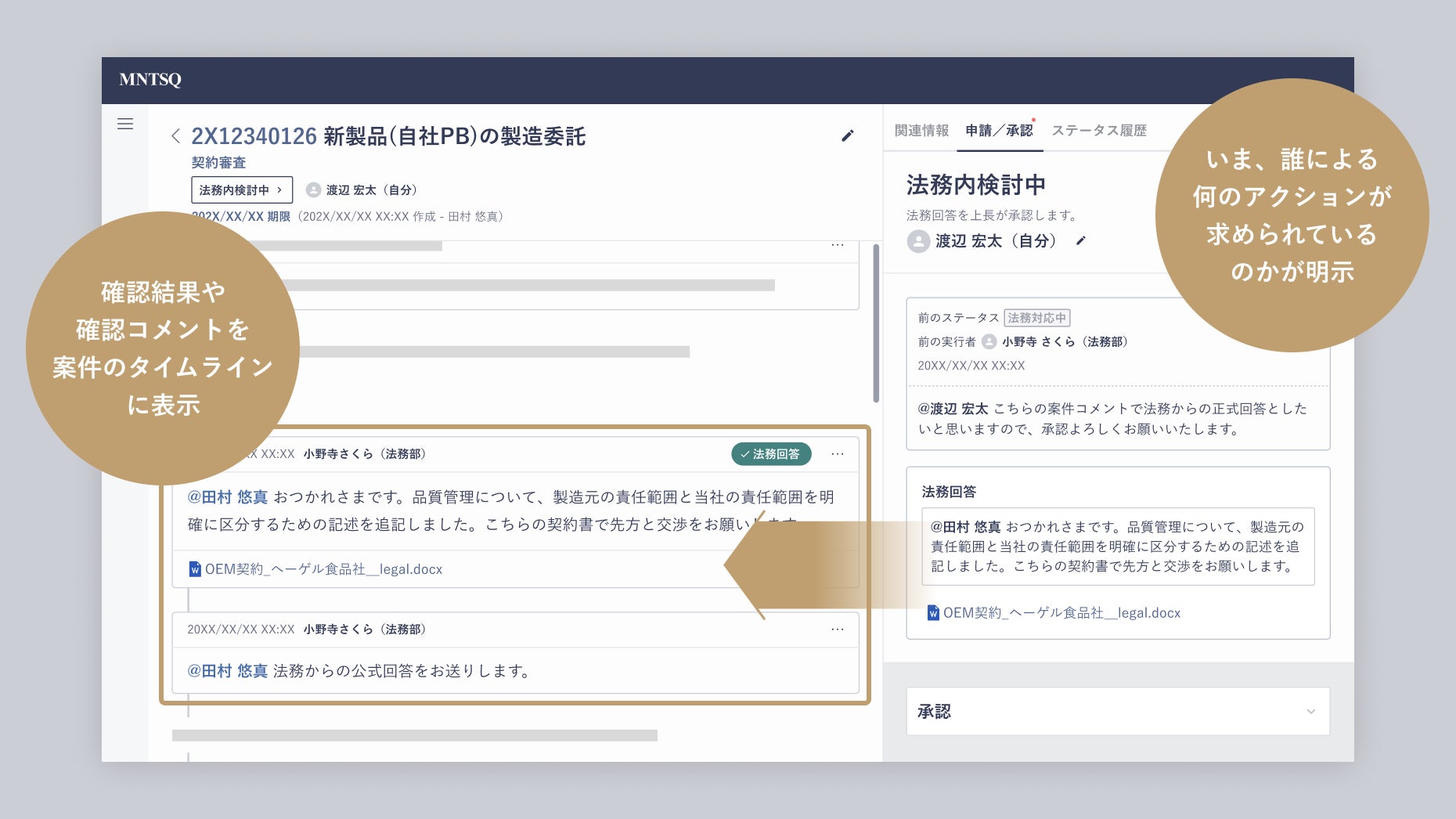 依頼部門内での事前確認、法務部門内での回答案確認など、部門内のチェックも任意の形でフローに組み込むことができ、確認結果や確認コメントを案件のタイムラインに表示する、という制御も可能です。