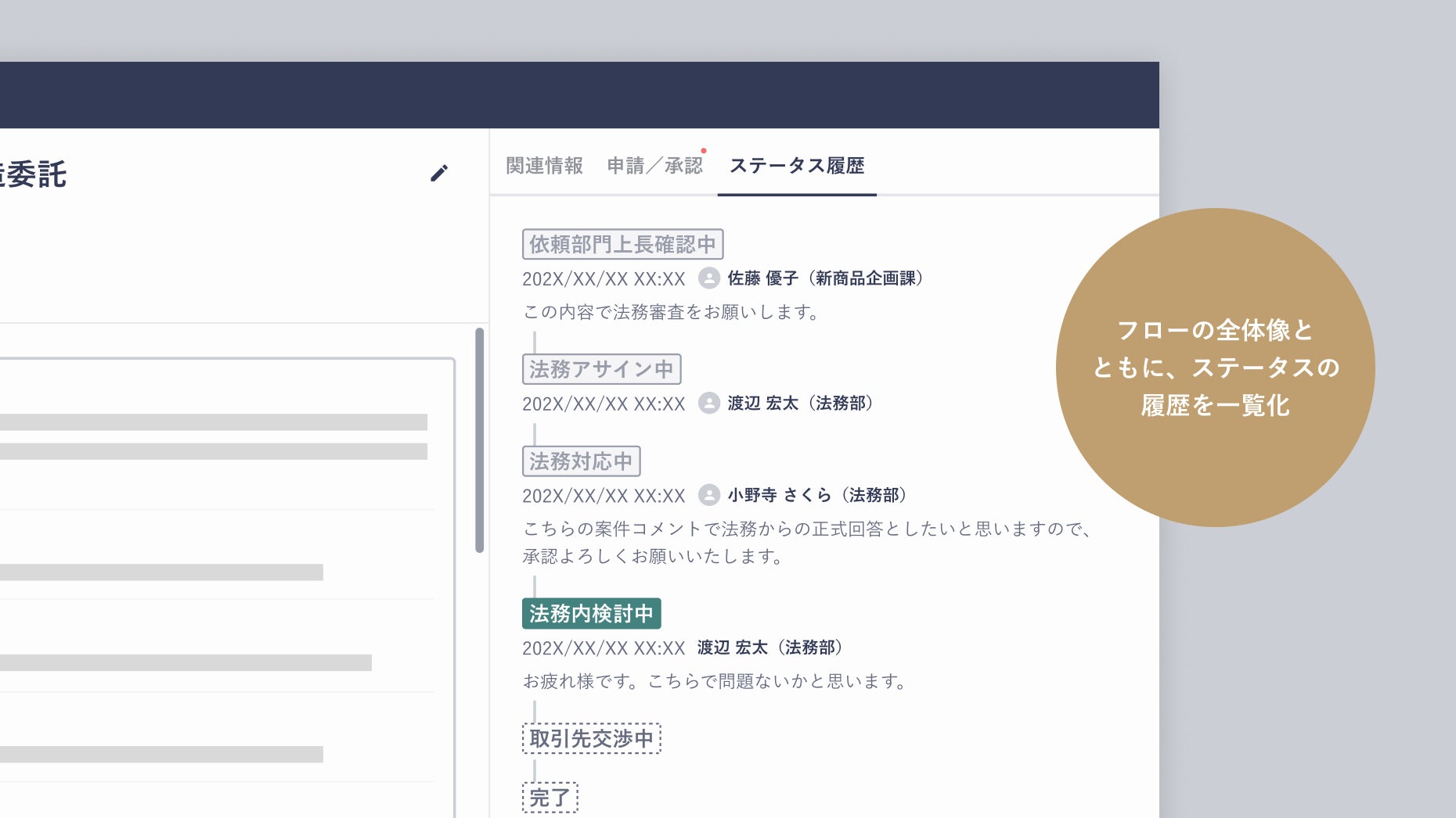 また、その案件が完了するまでに必要なアクションと実行者をステップごとに明示し、通るべきフローの全体像を表示するとともに、ステータス変更を伴う重要アクションの履歴を一覧化することも可能です。