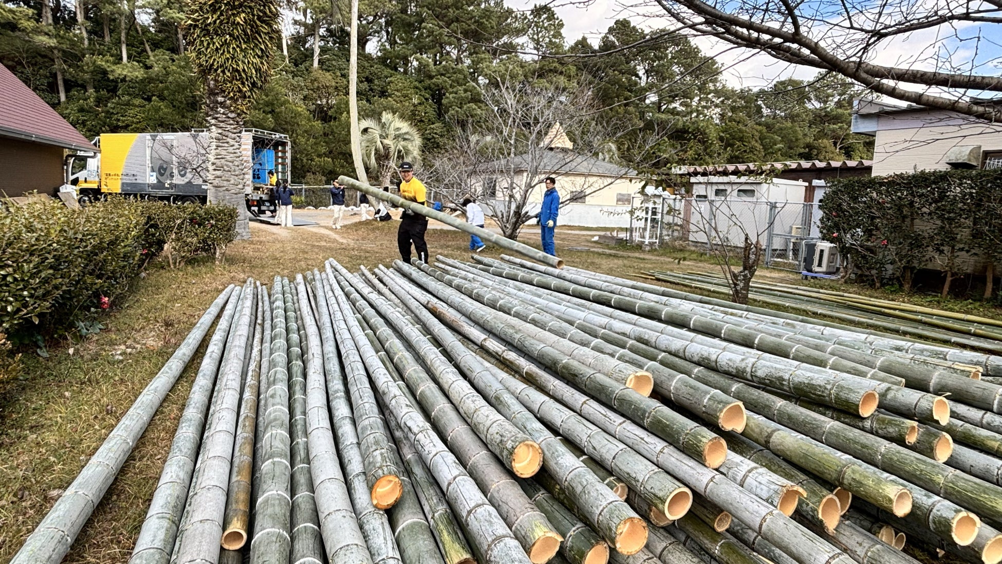 このたび当社は、同プロジェクト実行委員会(アドベンチャーワールド[和歌山県白浜町]、岸和田市)とともに、アドベンチャーワールド園内に設置されている超巨大竹アート作品「きらめく丘」の集中修繕活動(2026年1月10日開始)に協力いたしました。本活動において当社は、修繕に必要な竹の調達および輸送を担い、資源の循環利用とプロジェクトの継続支援に寄与しました。