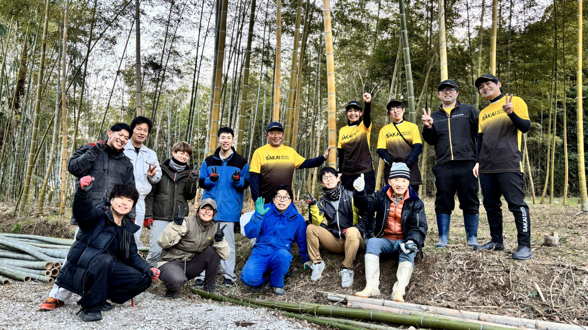 1月10日から12日まで岸和田市内の竹林で実施された竹の伐採作業の最終日に、サカイ引越センター従業員が参加しました。今回の活動では、集中修繕用の竹材を調達するとともに、竹の端材を竹チップへ加工し、岸和田市中央公園の床舗装材として有効利用される予定です。