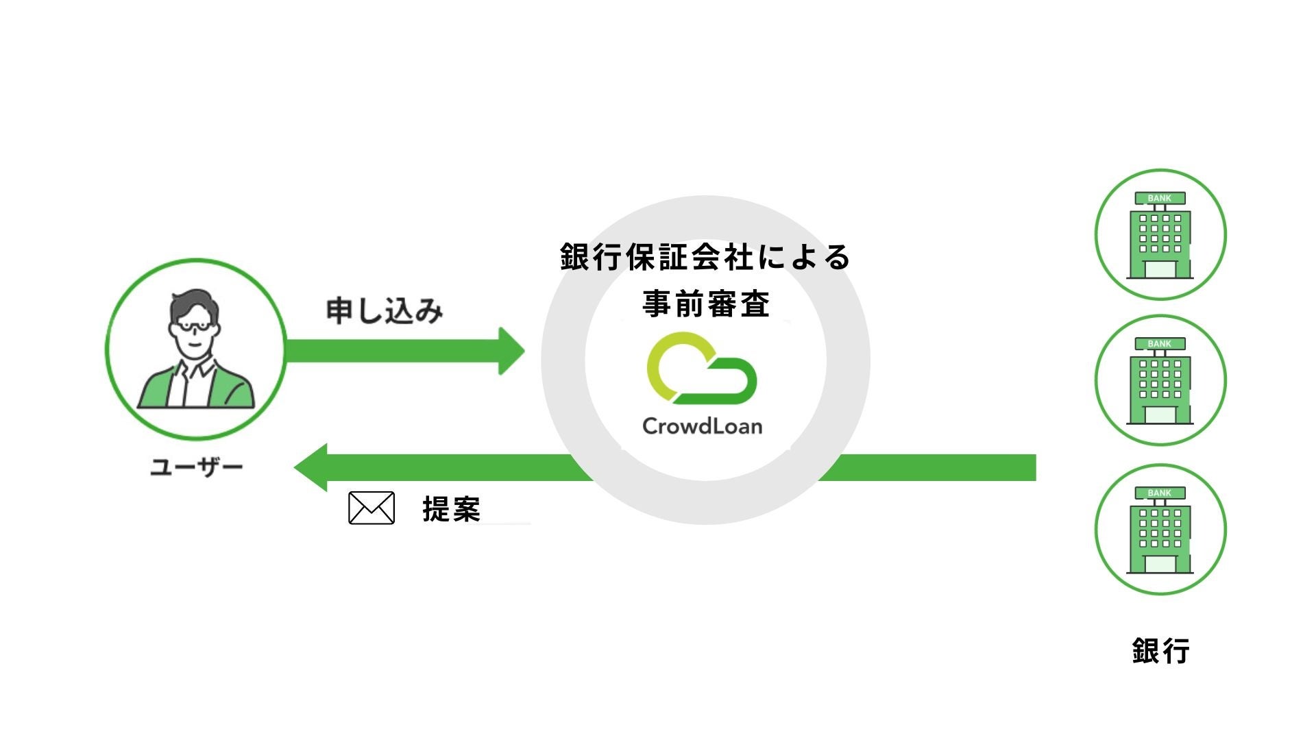 クラウドローンは、貸し手である銀行と借り手である個人を、オンラインでつなぐマッチングプラットフォームです。ユーザーは提携の銀行保証会社において事前審査を行うことで、自身にピッタリの銀行ローン選びができる国内初のサービスです。サイトでは、与信審査に必要な情報を約3分で入力を行うことができ、事前審査の結果は約3時間で回答が受取れます。