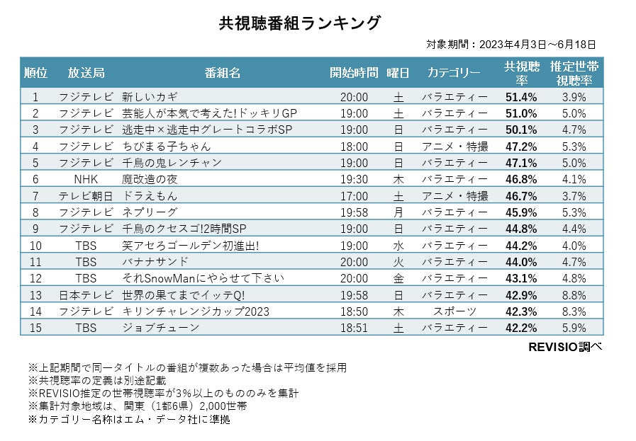 ご家庭に人体認識技術を搭載した機器を設置し、テレビスクリーンの「視られている量」を測るREVISIO株式会社(旧TVISION INSIGHTS、所在地:東京都千代田区、代表取締役社長:郡谷 康士、以下REVISIO)は、複数人が集まって見たテレビ番組は何だったのかについて、ランキングを用いて検証いたしました。