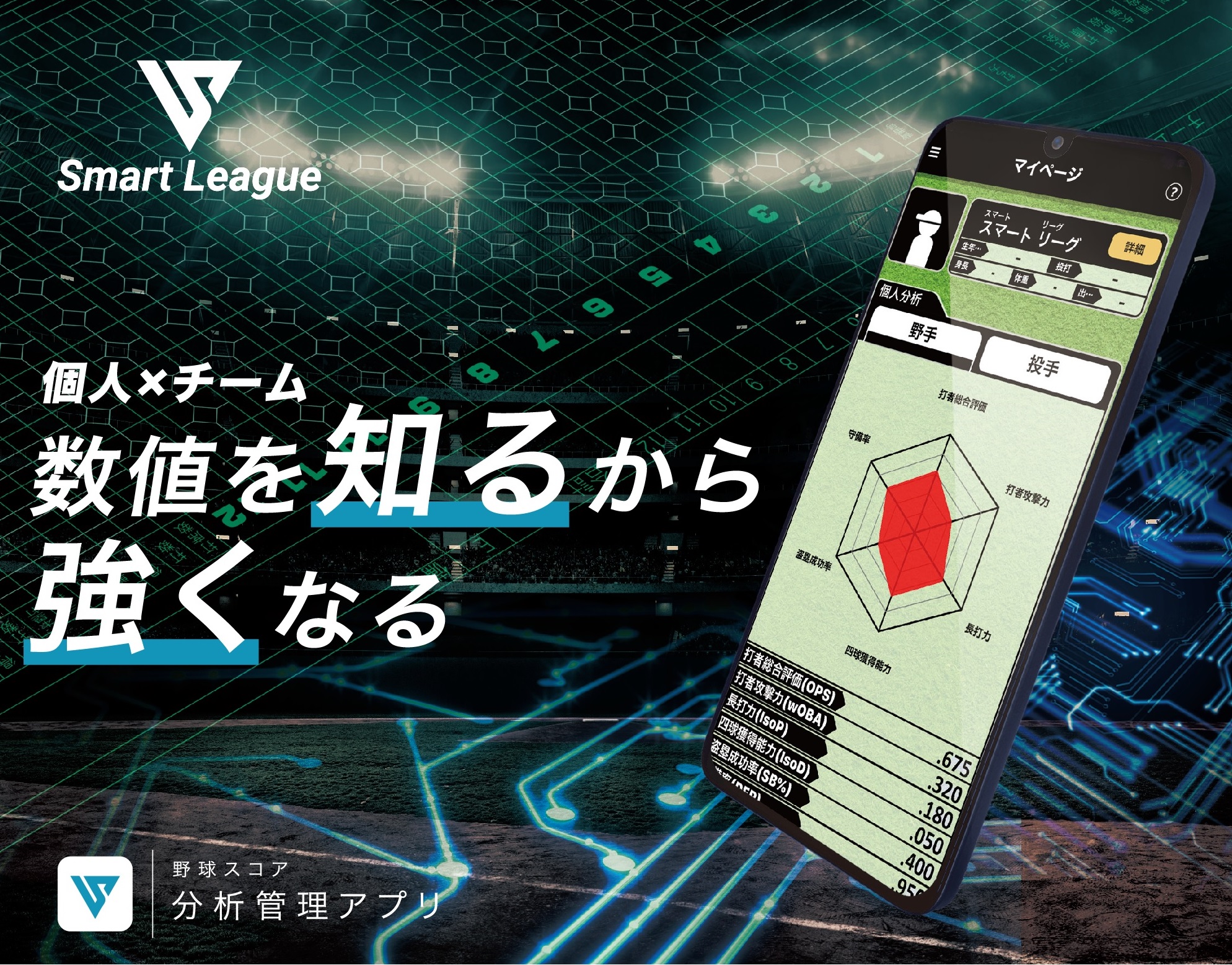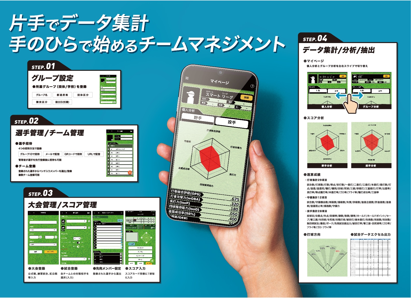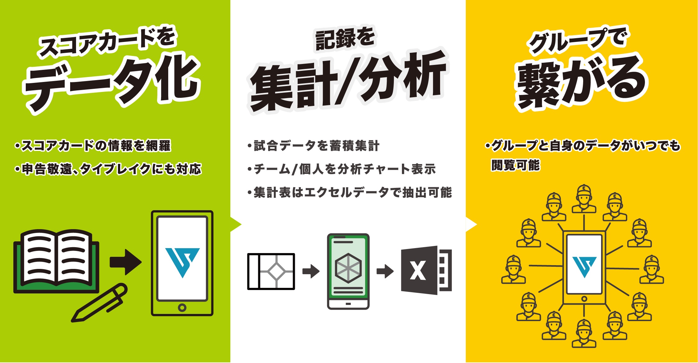 今回、スコア分析管理アプリをリリースする事で選手個々の特性と投打の技術面を組み合わせた戦略/戦術構築につなげます。