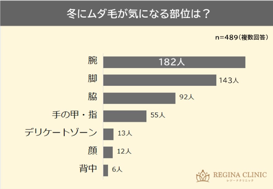 続いて「冬にムダ毛が気になる部位」を聞いたところ、最も多かった回答は「腕(182人)」、次ぐ2位は「脚(143人)」でした。腕まくりやスカート着用時など、冬であっても日常生活で露出することのある部位を気にする人が多いようですね。また冬は、「肌が乾燥する」「部屋や浴室が寒くて処理が億劫になる」という理由から、腕や脚のムダ毛処理がおろそかになってしまう人もいるようです。