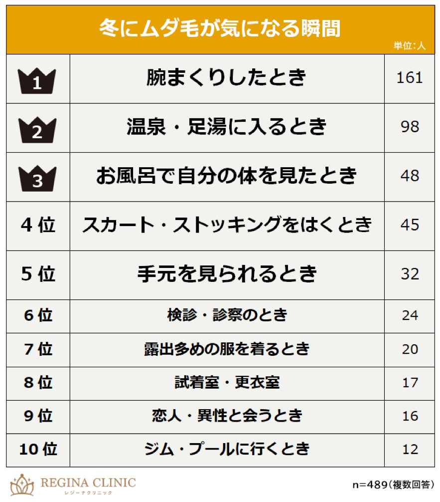 女性489人に「冬にムダ毛が気になる瞬間」を聞いたところ、圧倒的1位は「腕まくりしたとき(161人)」でした。特に、「暖房の効いた室内で無意識に腕まくりをして恥ずかしい思いをした」という声が多く寄せられました。2位には「温泉・足湯に入るとき(98人)」がランクイン。服で肌が隠れる冬は、「夏ほどこまめにムダ毛処理をしない」「ムダ毛の存在を忘れる」という人も多く、思いがけず肌を出す状況に慌ててしまうようです。
