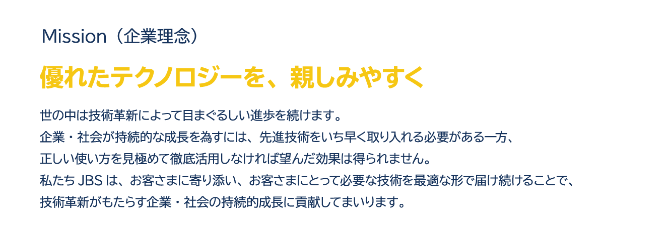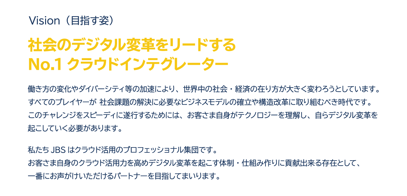 JBS は 1990年の創業以来、お客さまにとって必要な技術を最適な形でお届けするプロフェッショナルとして、お客さまに寄り添った課題解決を第一に考えてまいりました。そして、昨今 DX の必要性が叫ばれる中、社会における IT の存在意義を見つめなおしました。そして JBS として、創業以来大切にしている誠実な姿勢をベースとしながら、クラウドインテクレーターとして社会のデジタル変革をリードしていくことを強く示したいと考え、理念体系・ブランドロゴをリニューアルしました。