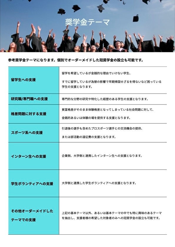 また、奨学金設立における他手法の一部では難しいとされる資金提供者の税制面の優遇や奨学生の選考方法や面談への関与も可能にするなど、資金提供者に対しても満足度の高いサービスとなることを目指してまいります。