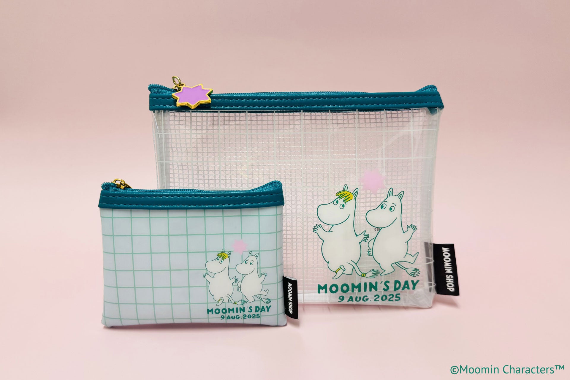 2つのサイズがセットになったムーミンの日のロゴ入りポーチ。小物の収納やバッグの中を整理するのに便利なサイズ感。
