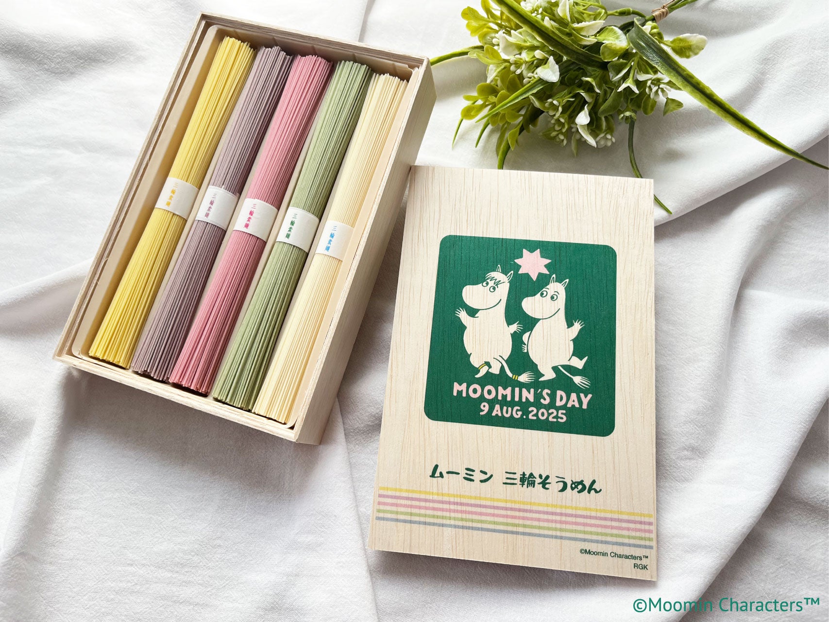 2025年の「ムーミンの日」のお祝いにぴったりの手延べ三輪そうめん。ロゴがデザインされた木箱に、黄色(かぼす)、紫(紫いも)、ピンク(梅)、緑(青しそ)、白(プレーン)各1束の計5束入り。