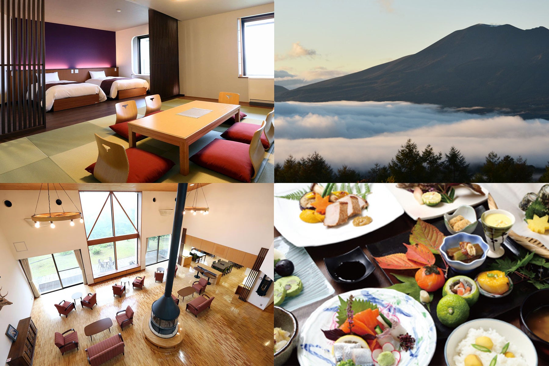 全客室、レストラン、ラウンジ、中庭から浅間連峰の山々やキャベツ畑を一望できるロケーション。