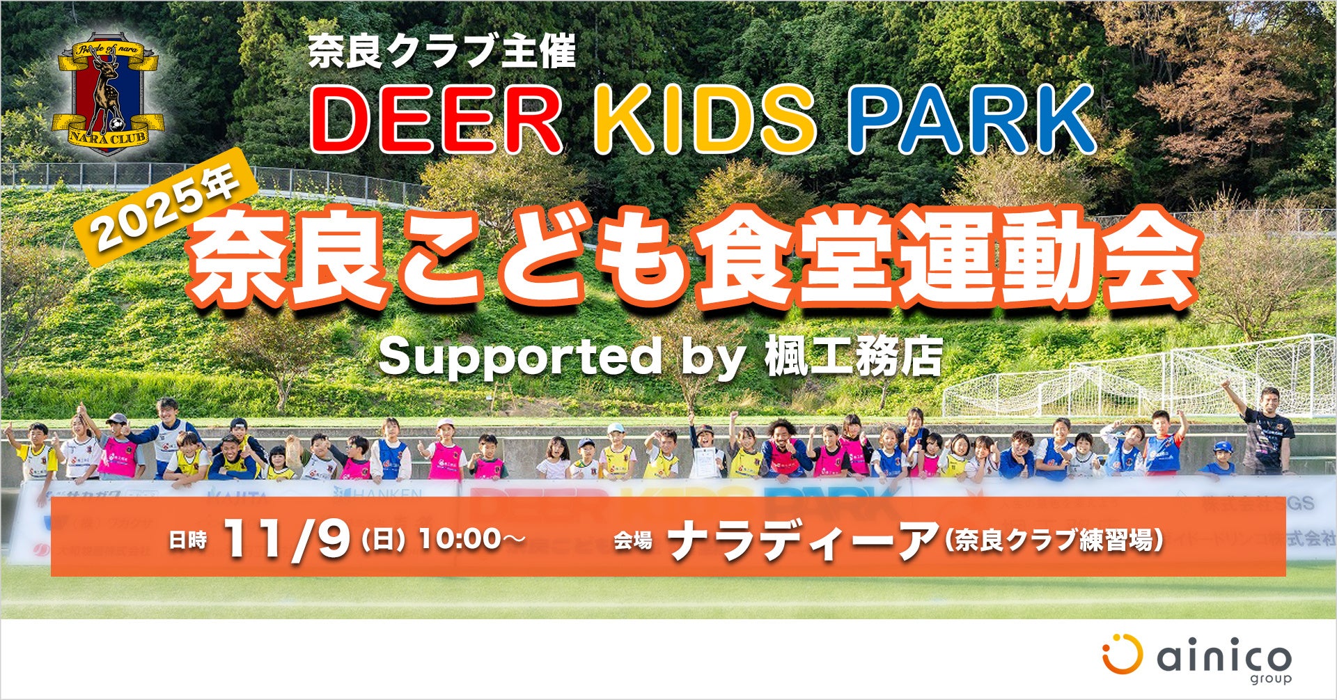 アイニコグループ株式会社(代表者:田尻 忠義、所在地:奈良県奈良市、以下当社)が展開する住宅事業ブランド「楓工務店」は、当社がプラチナパートナーを務めている奈良クラブが主催する「Deer Kids Park (読み方:ディアキッズパーク)奈良こども食堂運動会」に今年も協賛します。