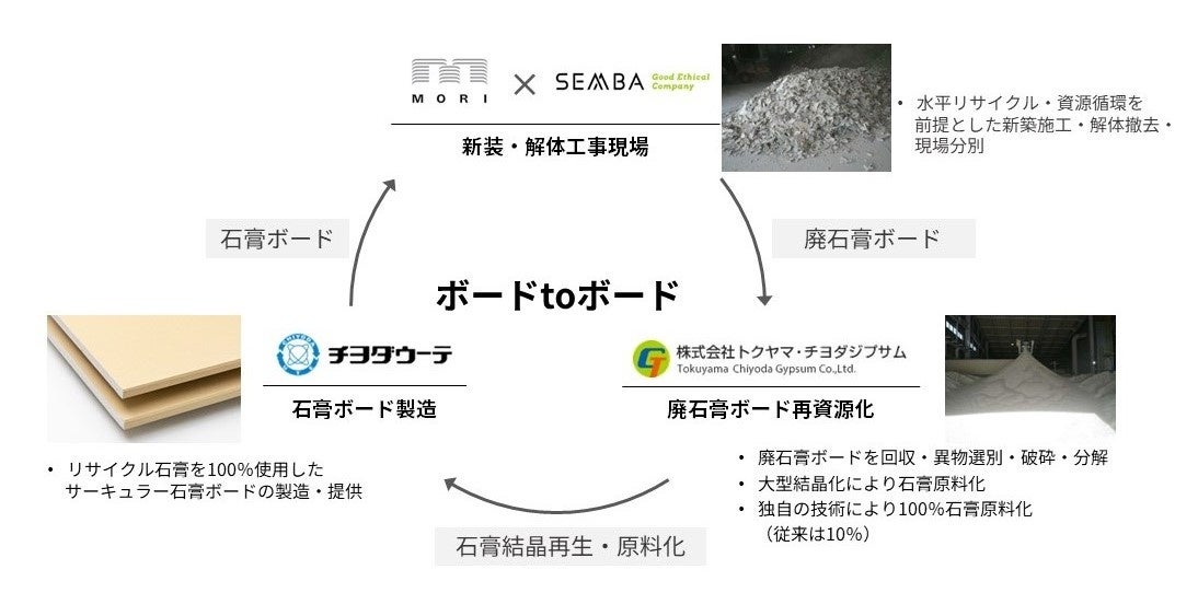株式会社船場(本社:東京都港区 代表取締役社長:八嶋大輔、以下、船場)は、資源循環型都市の実現に向け、森ビル株式会社(東京都港区、代表取締役社長 辻󠄀慎吾)、チヨダウーテ株式会社(本社:三重県四日市市、代表取締役社長:平田芳久)及び、株式会社トクヤマ・チヨダジプサム(本社:三重県三重郡川越町、代表取締役社長:加藤弘義)と協業し、建築物の壁や天井の内装材などで使用される石膏ボードの100%水平リサイクル(*1) “ボード toボード“の共同実証実験(以下「本実証実験」)を麻布台ヒルズで実施いたします。船場は、徹底的な分別回収、水平リサイクルを前提とした施工で、資源循環システム構築に貢献します。