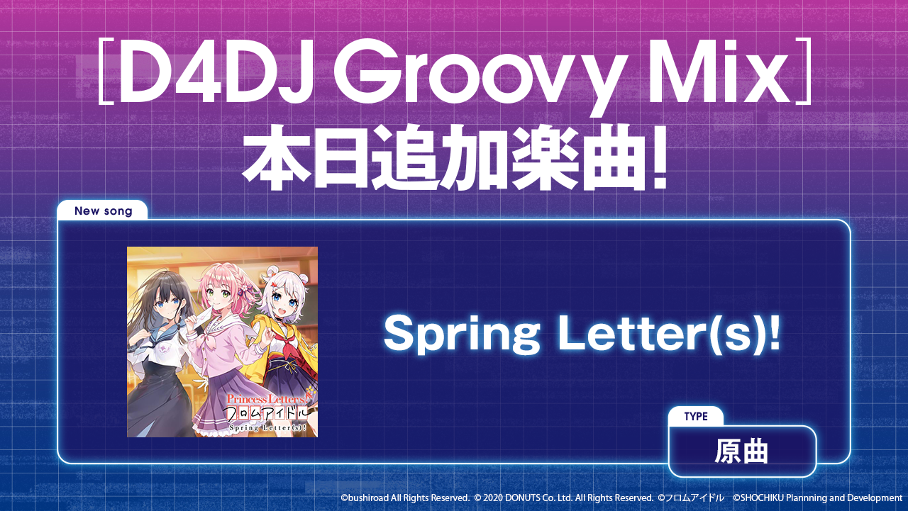 スマートフォン向けリズムゲーム『D4DJ Groovy Mix』に、『Princess Letter(s)! フロムアイドル』のポエトリーリーディング楽曲『Spring Letter(s)!』の原曲が、2021年12月30日(木)に実装される事が決定致しました。