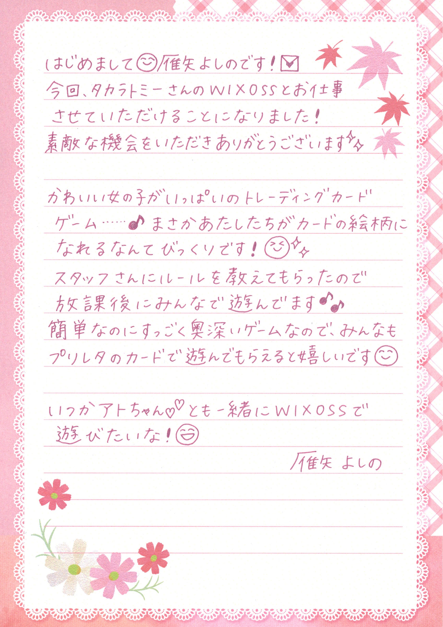 雁矢よしのからの手紙が欲しい場合:「#よしの手紙」「#プリレタ」