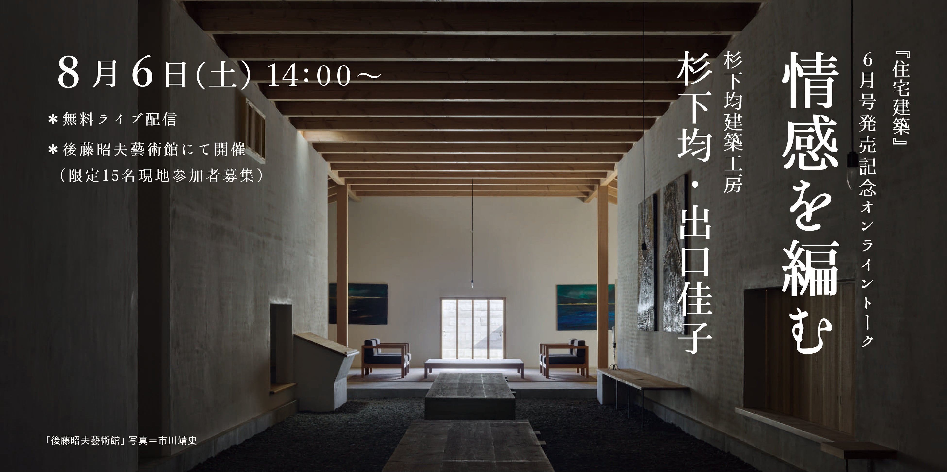 今回のトークイベントは、お二人が手掛けた建築で、誌面でもご紹介した岐阜県関市にある「後藤昭夫藝術館」で開催します。お二人の建築がどのように生まれるのか、影響を受けてきた建築や風景を中心に、後藤昭夫藝術館などの作品についてもお話しいただきます。トーク後半には質疑応答の時間も設ける予定です。また今回は、現地の参加者を15名募集します。空間を体験していただけるとともに、お二人と直接お話しいただける貴重な機会です。- 開催概要