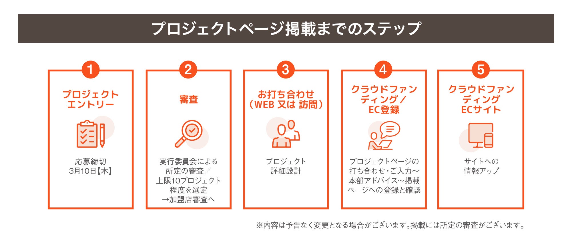 - 実行員会による所定の審査(上限10プロジェクトを選定)⇒加盟店審査へ