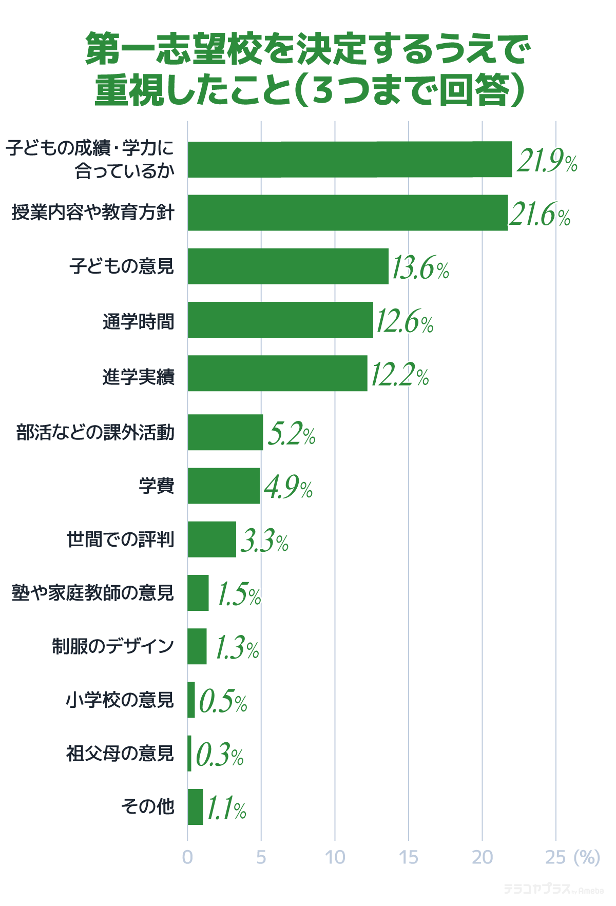 「子どもの意見」(13.6%)と回答した保護者も、「第一志望校に通っている保護者の方から学校の情報を詳しく教えてもらったり、過去問をいただいたりして、子どもに合っているか事前に確認した」、「親子で学校説明会に行って話を聞き、家に帰って話し合いをしました!」と話しており、子どもの意見を尊重しつつも、保護者による事前の下調べがしっかりおこなわれていたことが伺えます。