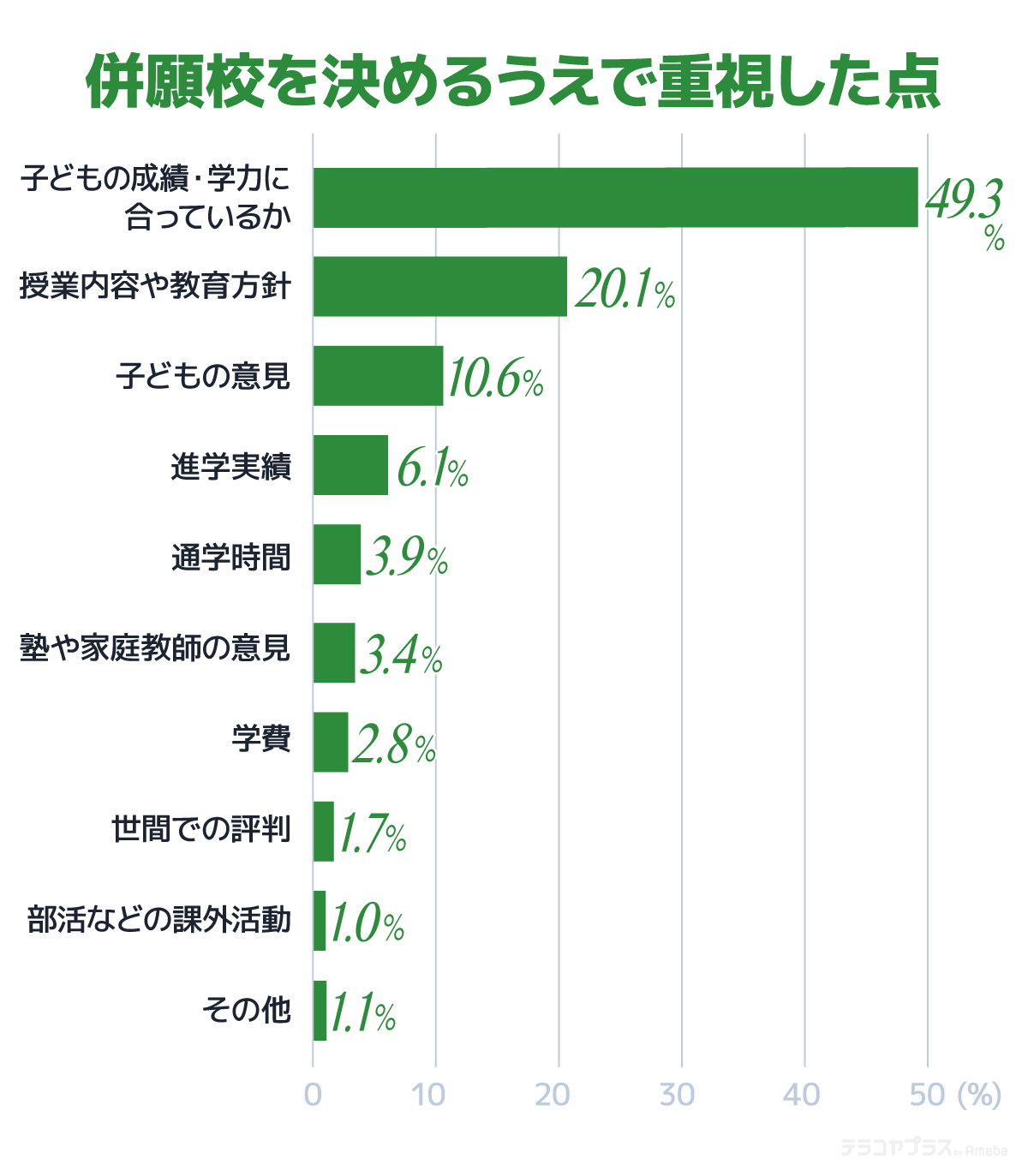 併願校を決めるうえで重視した点については「こどもの成績・学力に合っているか」が約5割(49.3%)。次点の「授業内容や教育方針」(20.1%)の2倍以上でした。