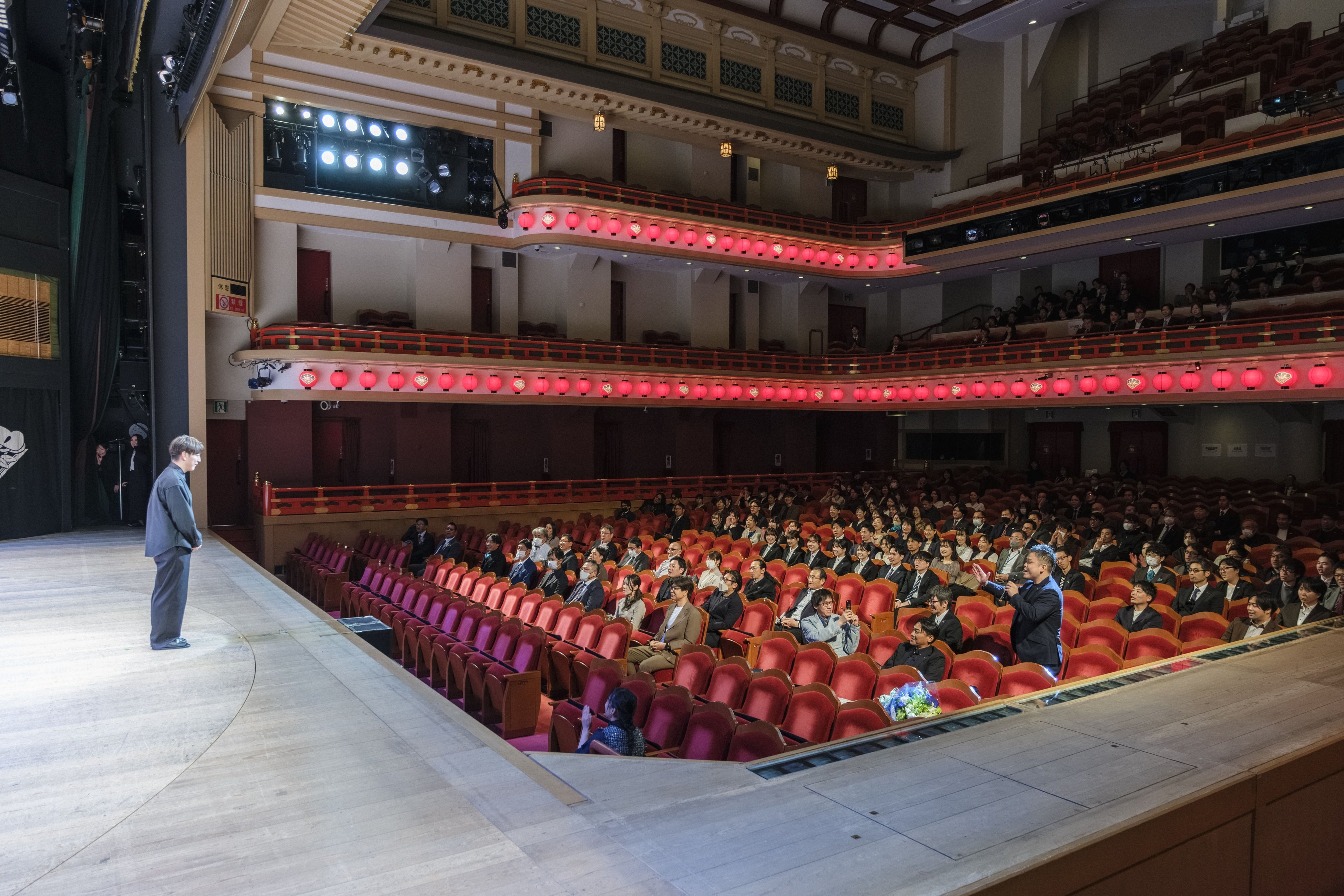 その感動の余韻の中、第1部後半では2026年度新入社員7名の入社式が執り行われました。歌舞伎座ならではの舞台機構である「せり」から登場した新入社員たちは、一人ずつセンターマイクの前に立ち、自らの「原点となる言葉」と未来への意気込みを力強く発表しました。 長きにわたり技術と精神を守り抜いたベテラン社員から、次なる成長の原動力となる新入社員へとバトンが受け継がれる象徴的な時間となりました。