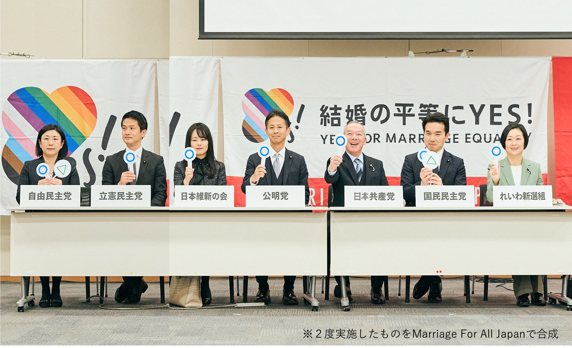 同性婚への公式方針を表明する場では、7つの主要政党の代表者が出席。「法整備を進めるか」という質問に対して各党の立場を「○」「×」「△」の札を掲げる形で回答しました。