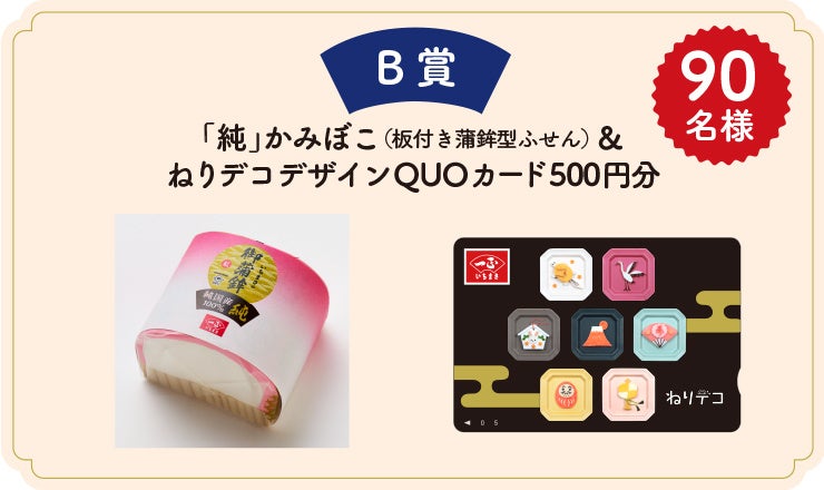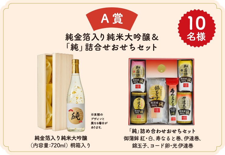 「純金箔入り純米大吟醸1本&『純』詰合せおせちセット」または「『純』かみぼこ(板付き蒲鉾型ふせん)1個&ねりデコデザインQUOカード500円分」が合計100名さまに当たります!