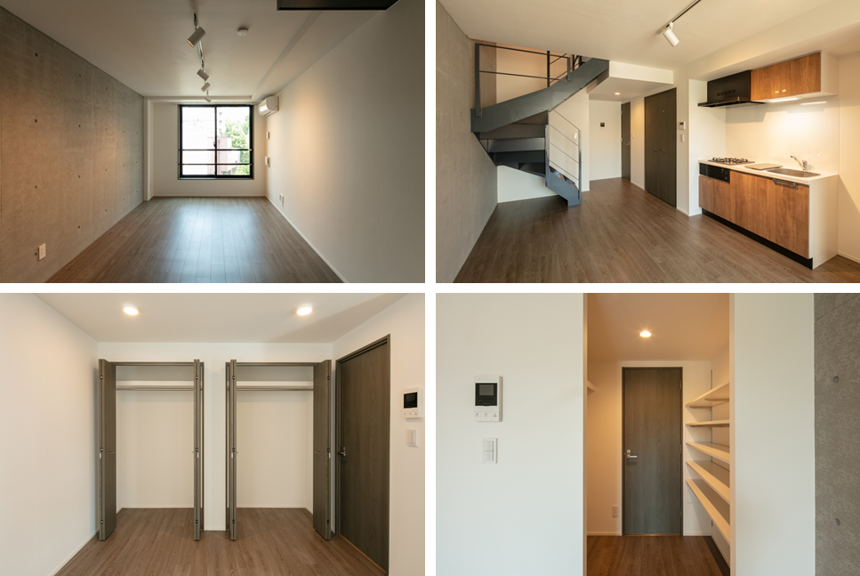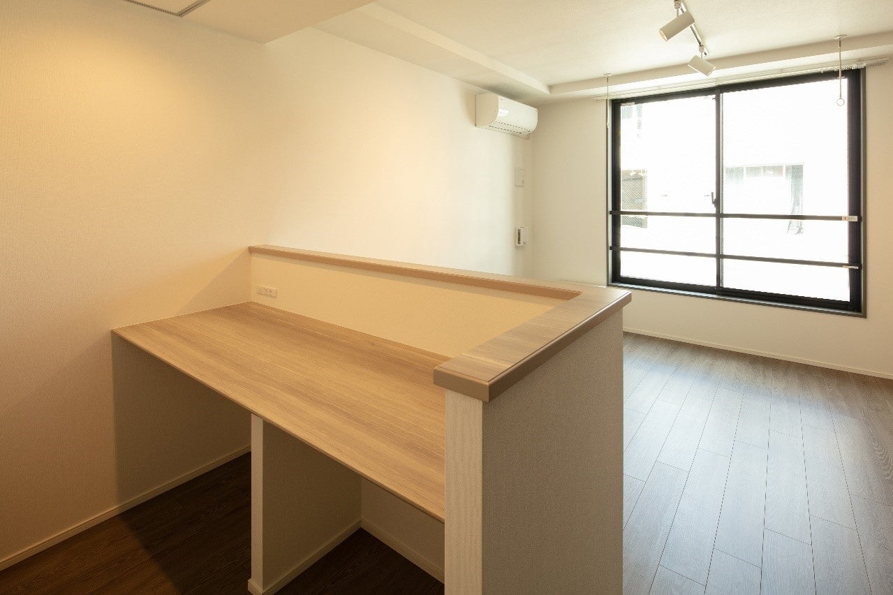 当物件の外観はLEGALANDの特徴であるコンクリートの打放しでシンプルに仕上げています。内装の特徴としては、新型コロナ感染症の影響による働き方の変革に伴うリモートワークの環境確保に、全ての1Rのお部屋にワークスペース空間を設けました。1Rでありながらも、もう一つお部屋があるように、リモートワークをはじめ、趣味等の特別な空間としてご使用いただけます。