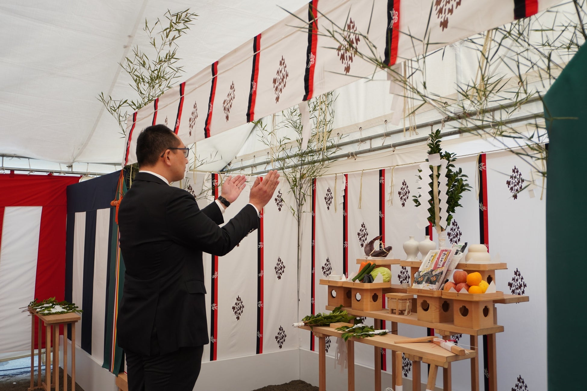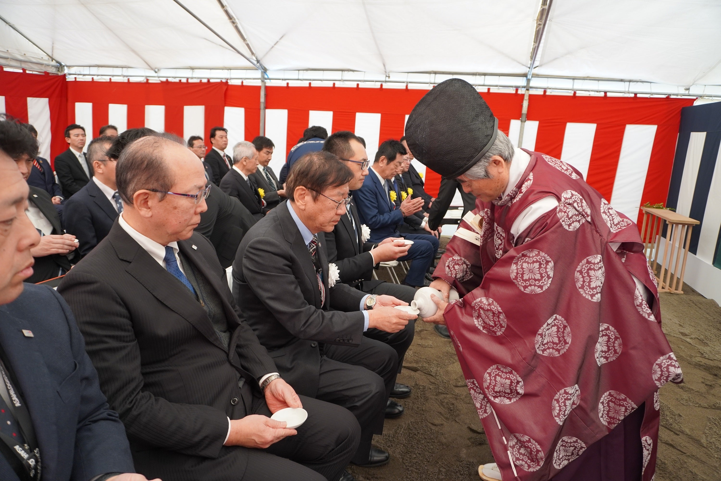 花見台共配センターの着工に際し、2024年2月14日に地鎮祭を執り行いました。式典には、当社関係者、工事関係者の皆さま27名が参列し、工事の安全と守護を祈念いたしました。