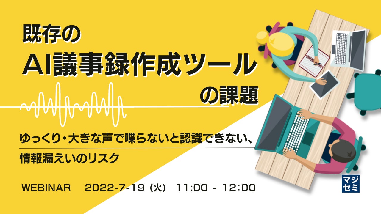 そこで本セミナーでは、音声認識の精度とセキュリティの問題をクリアして議事録作成を効率化する方法について解説します。