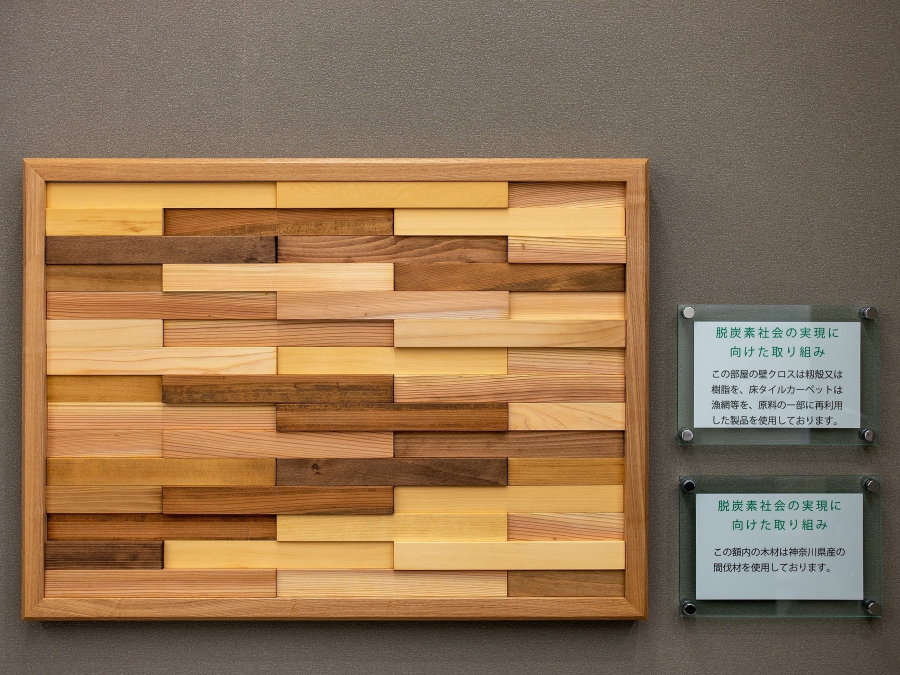 小田急グループでは2050年のカーボンニュートラル達成に向けて各種施策を推進しており、新店舗では、リサイクル材を活用したタイルカーペット・壁紙、環境配慮仕様のフロアタイルを内装材として採用しています。また、3室ある各個室の壁面を装飾するアートパネルは、神奈川県産の間伐材を用いました。