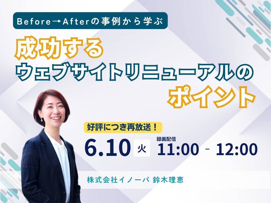 株式会社イノーバ(東京都新宿区、代表取締役:宗像 淳)は、2025年6月10日(火)、「Before→Afterの事例から学ぶ 成功するウェブサイトリニューアルのポイント」と題し、ウェブサイトリニューアルに関する30分のミニセミナーを再放送いたします。