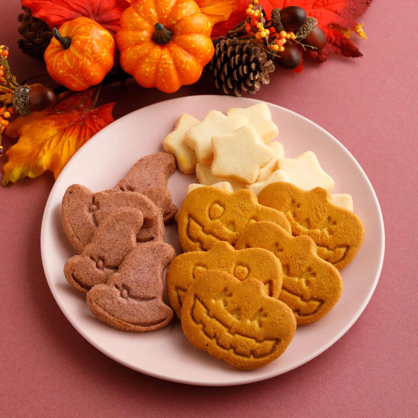 かぼちゃ(パンプキン風味)・魔女の帽子(紫芋風味)・星(プレーン)の3種のアソートクッキー