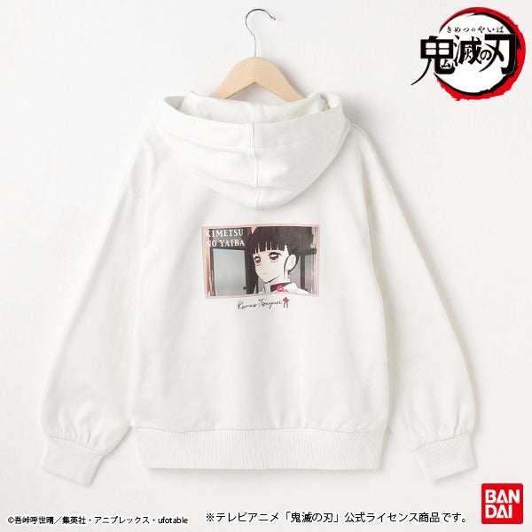 プルパーカーは、キャラクターの着物や羽織、髪飾りをモチーフにした襟元のリボンがポイント。バックにはそれぞれのアニメのシーンがプリントされています。胸元にはキャラクターモチーフの刺繍が施された豪華な仕様となっています。