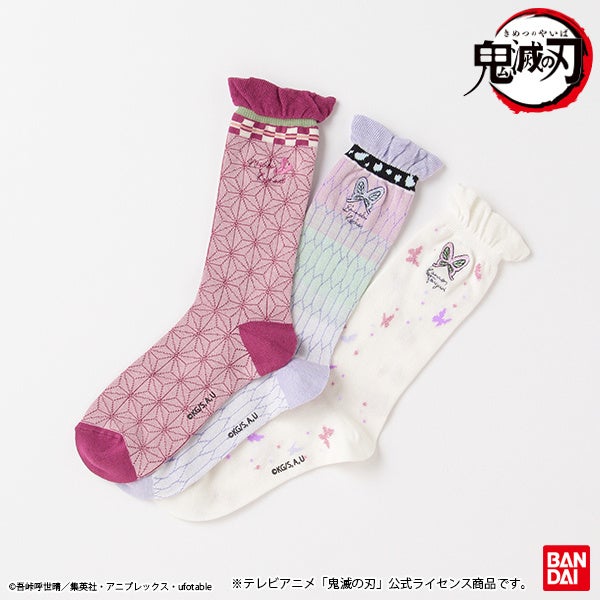 ソックスも各キャラクターの着物や羽織をモチーフとしたデザインとなっています。刺繍のワンポイントや履き口にフリルが施された可愛らしいアイテムです。