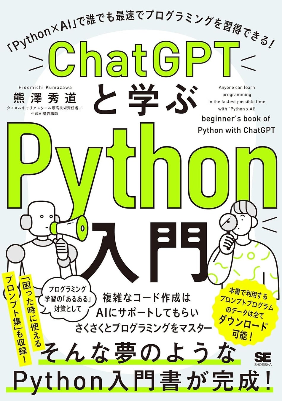 11月22日発売書籍『ChatGPTと学ぶPython入門 「Python×AI」で誰でも最速でプログラミングを習得できる!』を活用したプログラミングスクールの運営希望、書籍内容をテーマとした社内研修、リスキリング研修、学校等への講演、各種イベント登壇、ウェビナーゲスト登壇など、各種ご依頼を受け付けいたします。