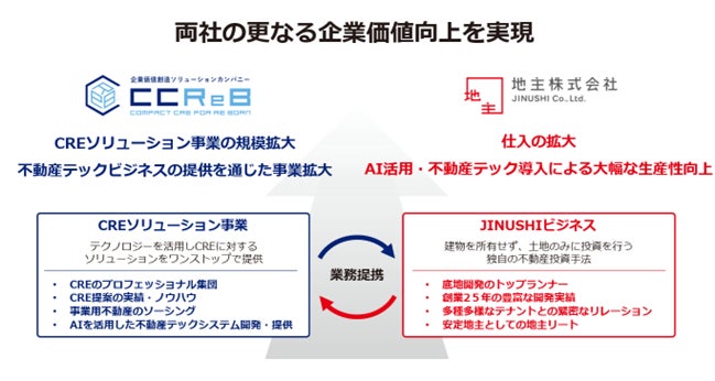 本業務提携は、当社の不動産テックビジネスの事業拡大を通じたCREソリューション事業の発展と、地主社のJINUSHIビジネスにおけるCRE領域の強化及びAIを活用した不動産テックシステムの開発・導入等による仕入拡大を通じた、両社の更なる企業価値向上の実現を目的としています。