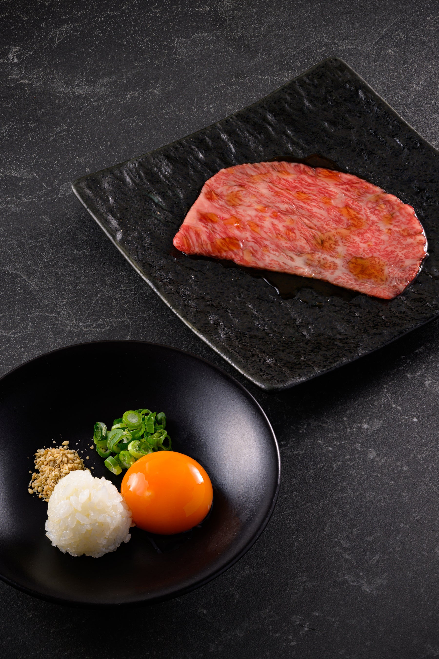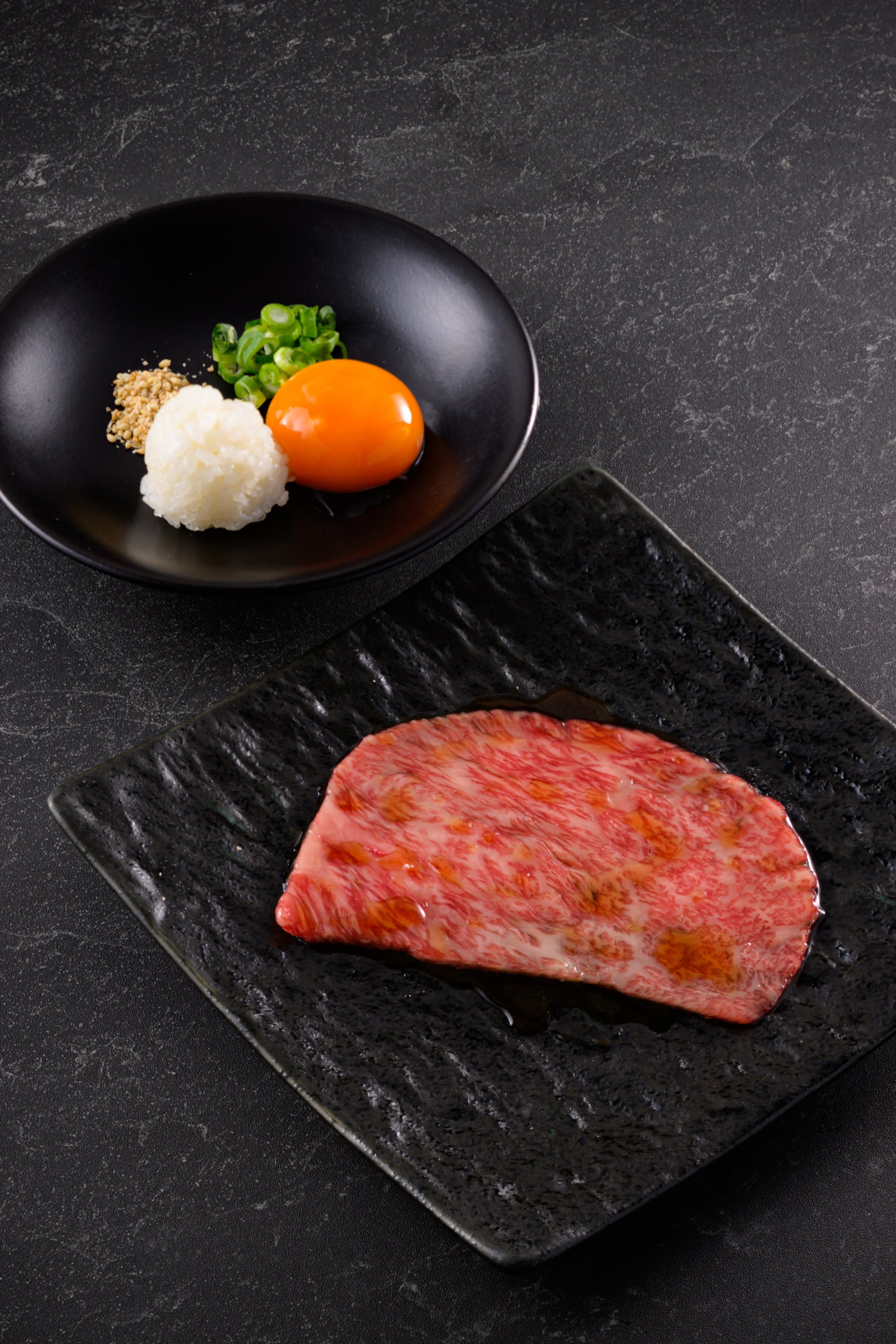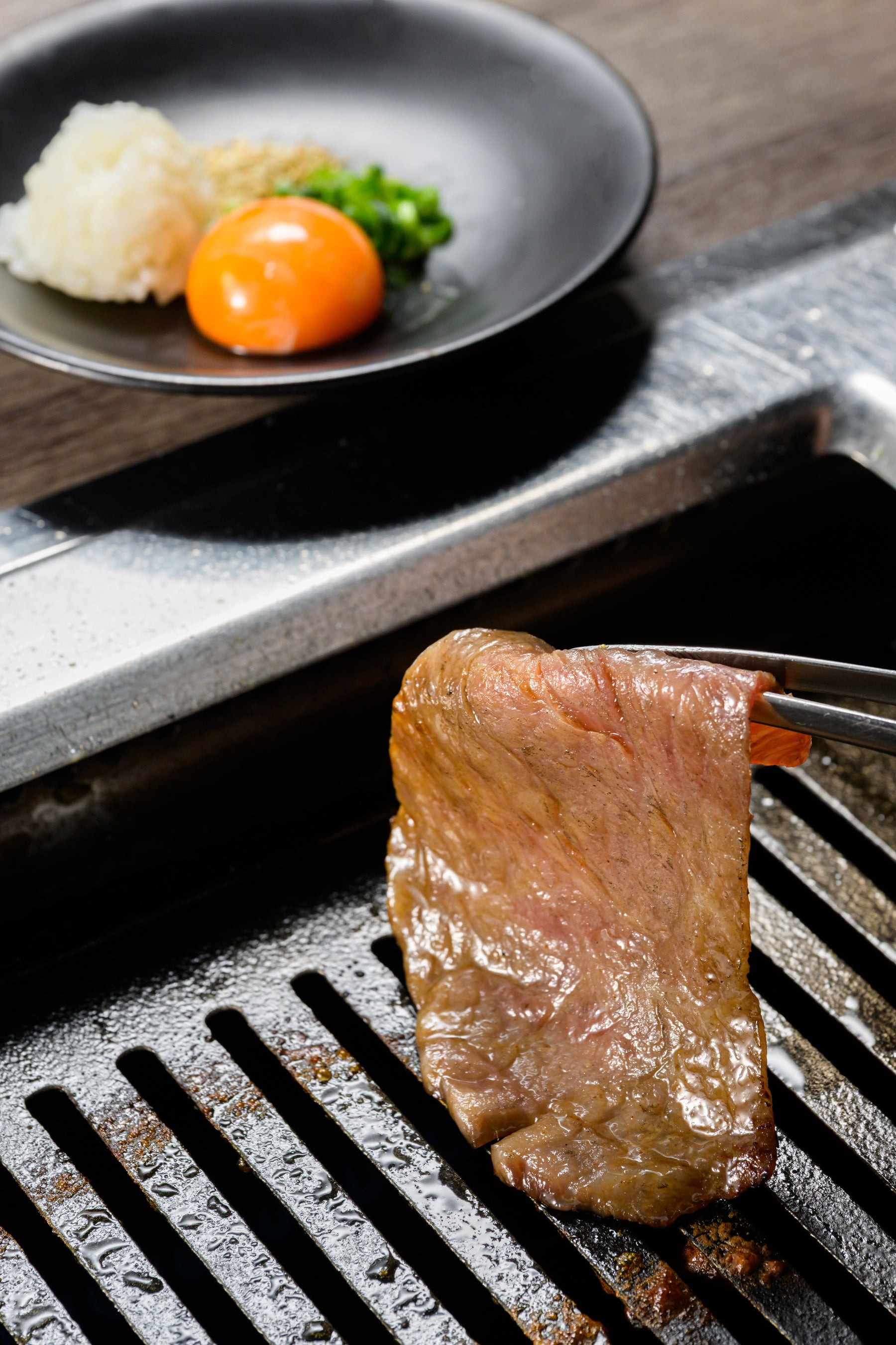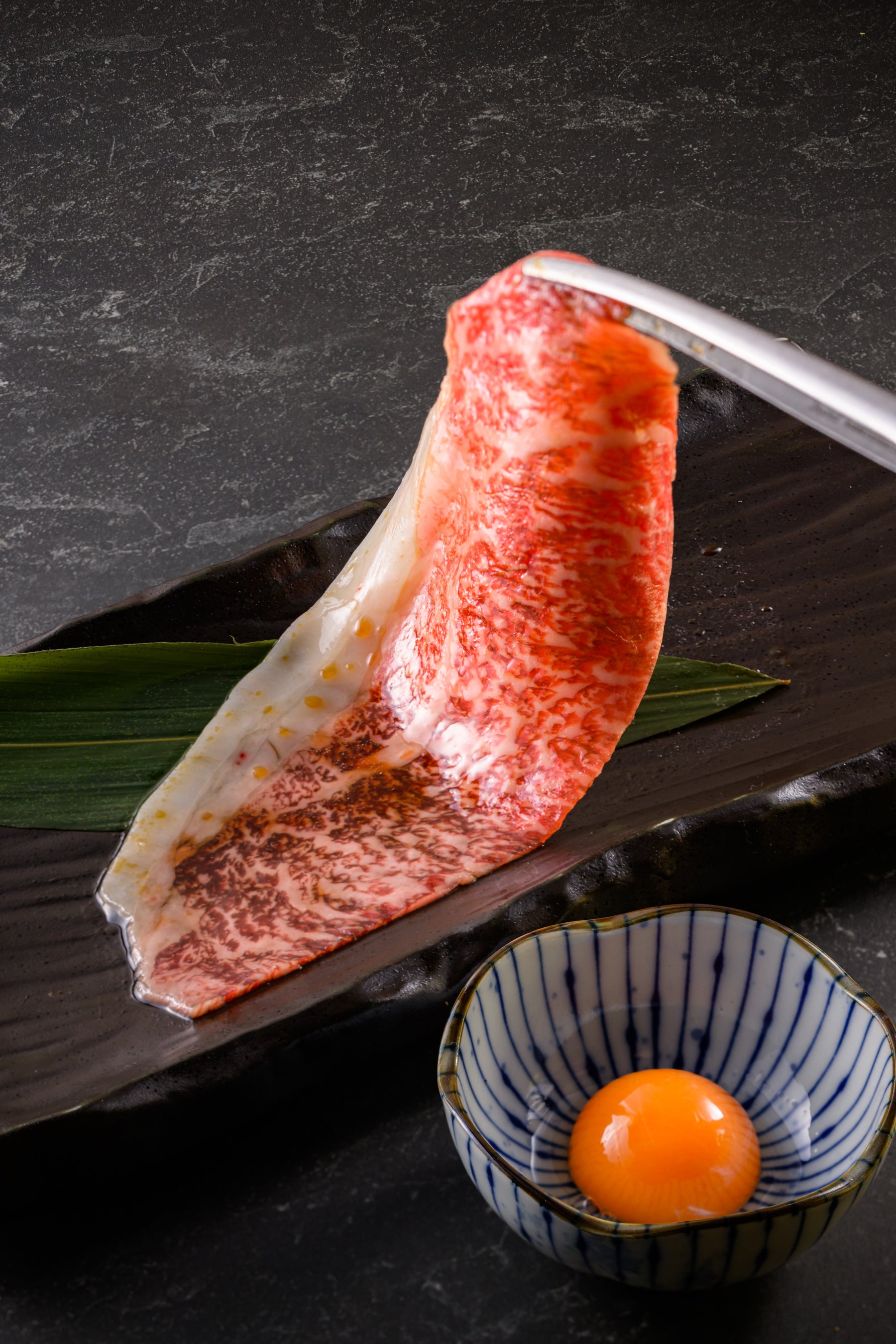 銘柄黒毛和牛のサーロインをサッと焼いて、卵黄に絡めて食べると、とろけるような食感とともに上質な甘みと旨味が口いっぱいに広がる。