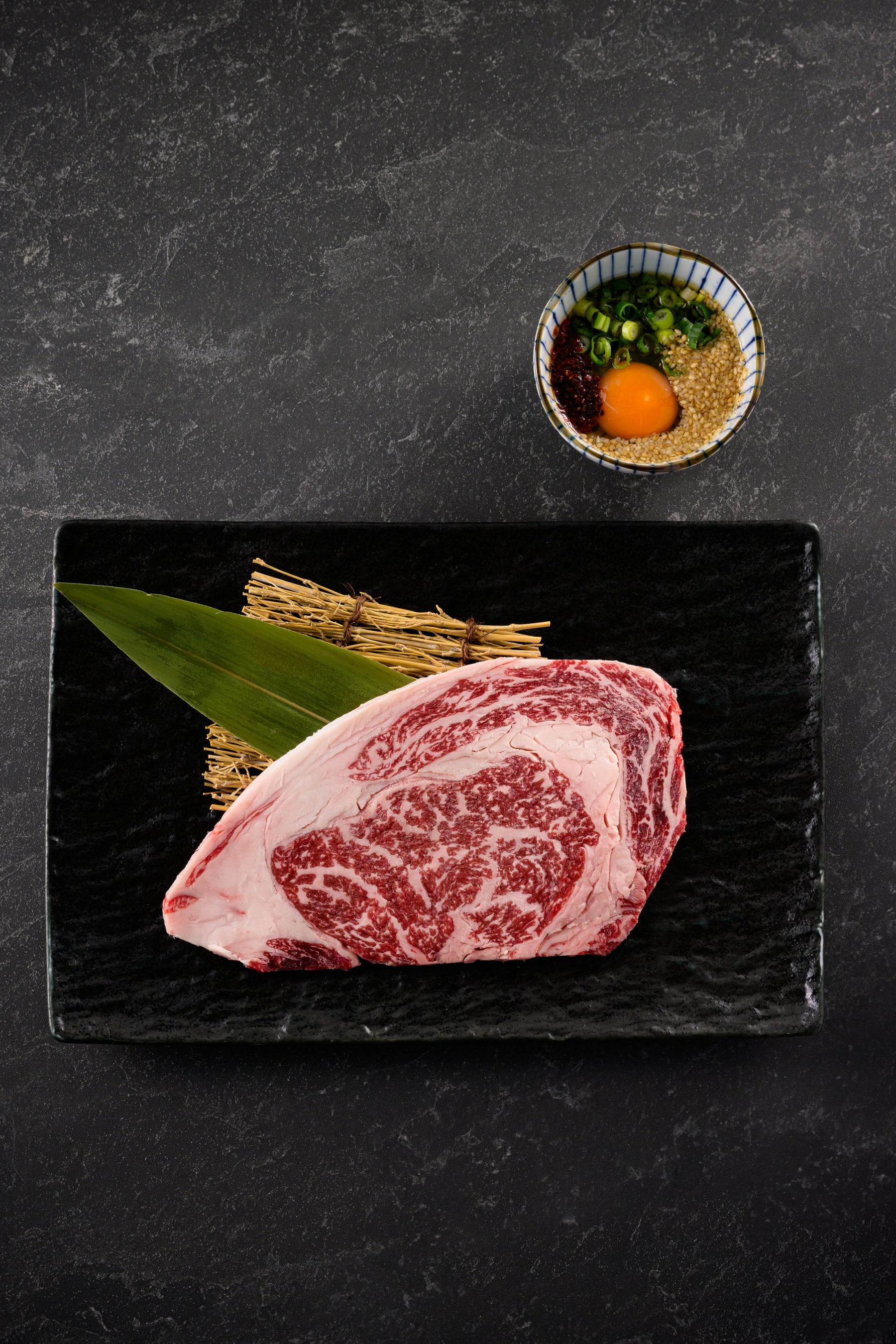 ジューシーなリブロース100gを特製月見ダレで堪能する、迫力ある一皿。