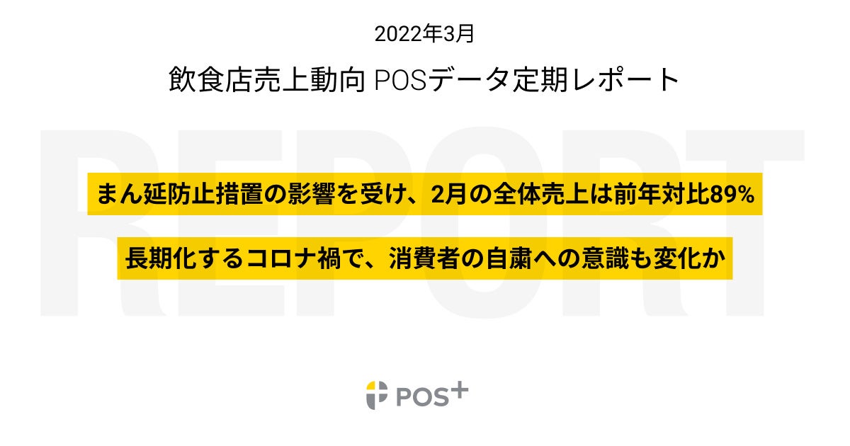 クラウド型モバイルPOSレジの「POS+(ポスタス)」を提供するポスタス株式会社(本社:東京都中央区、代表取締役社長:本田 興一)は、2022年2月度の飲食店売上動向についてPOSデータを基に集計し、結果をとりまとめましたのでお知らせします。