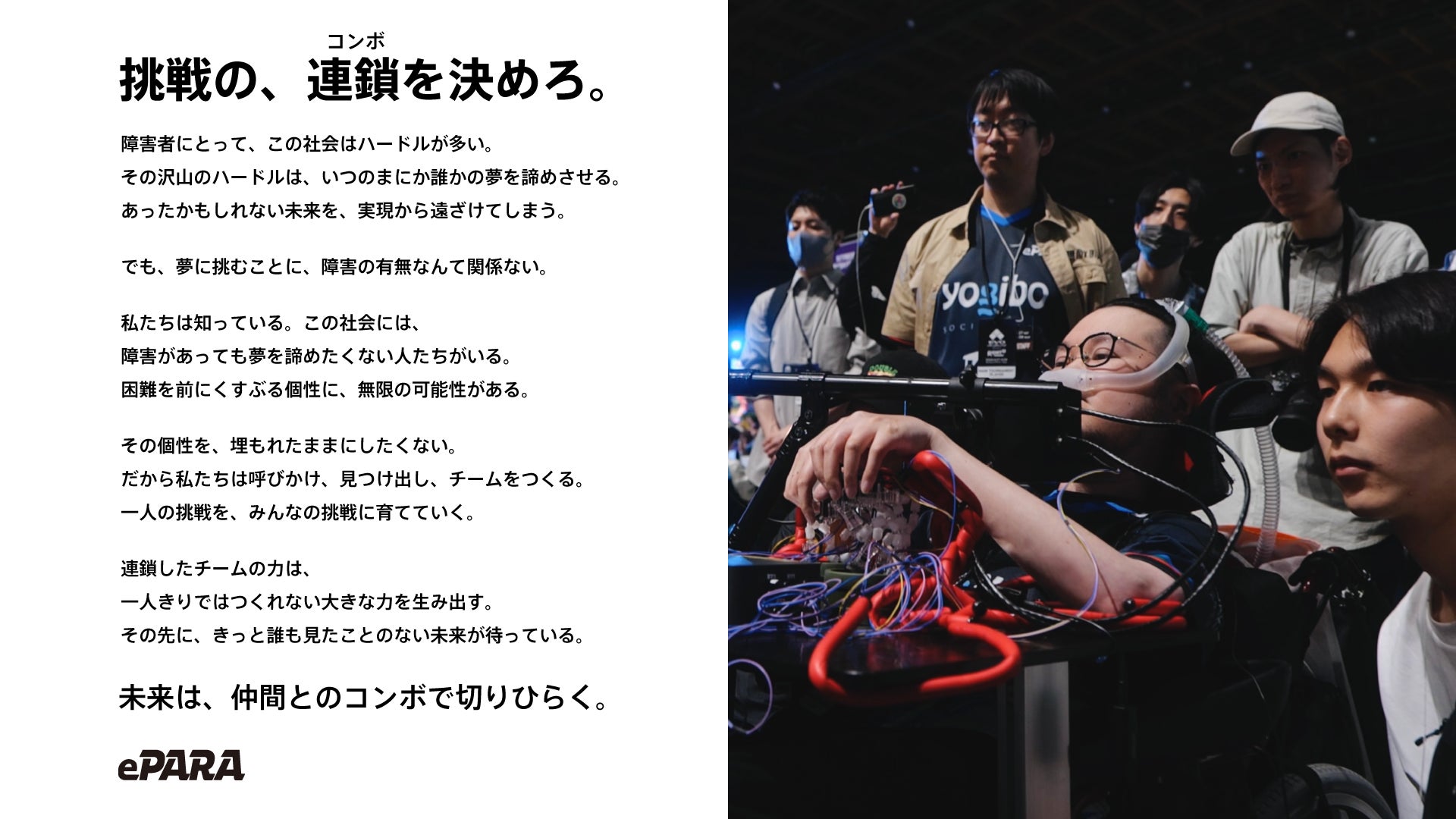 株式会社ePARAは、これまで年齢・性別・時間・場所・障害の有無を超えて参加できるバリアフリーeスポーツを提唱し、「本気で遊べば、明日は変わる。」を合い言葉として活動してまいりました。株式会社ePARAは、これまで培ってきた知見・経験を踏襲しながら、事業全体の新たなステートメントを掲げ、活動領域を拡げます。eスポーツを通じた障害当事者のウェルビーイングの向上・障害者の活躍できる舞台の拡大を図り、障害の有無に関わらず多様性の中で個人がいきいきと輝くことができるDE&Iの浸透に貢献するインパクトスタートアップ企業になるために、心をひとつに邁進してまいります。