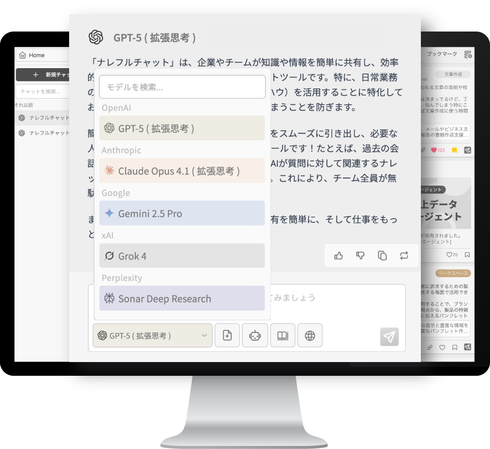 ① マルチAIモデル対応:ChatGPT・Gemini・Claude・Grok・Perplexityなどの最新生成AIモデルに対応。各モデルの特性を活かした最適な活用をAIが自動サポート