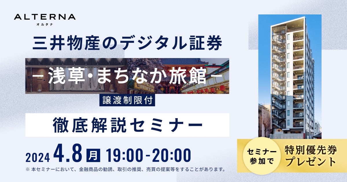 「三井物産のデジタル証券〜浅草・まちなか旅館〜(譲渡制限付)」の公開に合わせて、案件の詳細や、ホテル市場の動向などについて解説するセミナーを開催します。ぜひご参加ください。