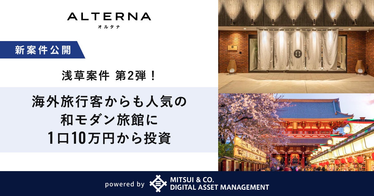 三井物産デジタル・アセットマネジメント株式会社(以下「当社」)は、当社が提供するデジタル証券を活用した安定資産投資サービス「ALTERNA(オルタナ)」において、「三井物産のデジタル証券~浅草・まちなか旅館〜(譲渡制限付)(※1)」を公開、募集を開始しましたことをお知らせします。