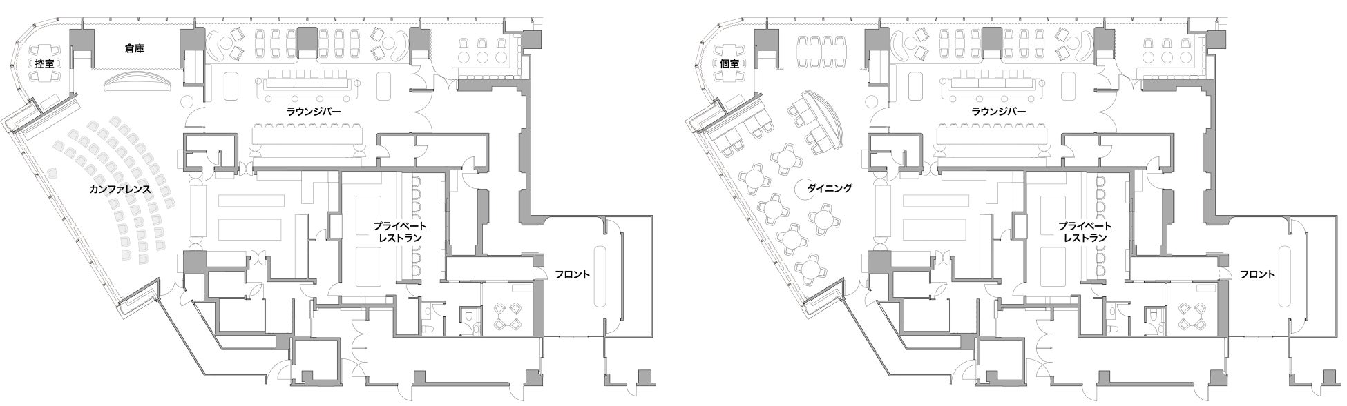 カンファレンス開催にも対応した大型スクリーンに本格的な音響設備と天井高さ約4mを有する大空間。ライブ感のあるオープンキッチンに面した60席のダイニング利用や、ダイニングとラウンジバーを一体的に活用した130席超の利用など、使い方に合わせて柔軟に対応できるレイアウトです。開催内容に応じてパーティーフードやケータリングの商品企画やオペレーション提案も可能です。