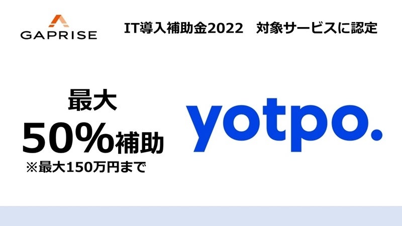 之、以下「当社」)が提供するUGCマーケティングテクノロジーのYOTPOは、昨年度に引き続き、経済産業省が推進する「IT導入補助金2022」の対象サービスに認定されました。これにより、中小企業・小規模事業者等がYOTPOの導入を行う際の経費の一部が最大50%補助されることとなりました事をお知らせします。