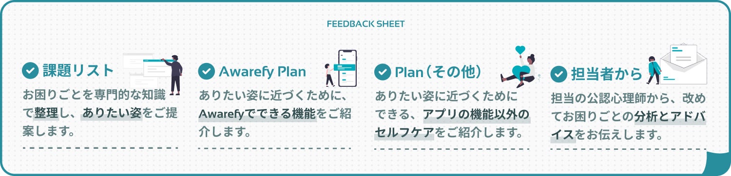 フィードバックシートでは、初回ヒアリングで分かったことや、ユーザーのお困りごとを整理し、ネクストアクションを提示し、あなたにおすすめしたいAwarefyの機能や、日常生活でできそうなセルフケアをご紹介します。これにより、一人ひとりのユーザーが自分自身の心の健康をより良く理解し、具体的な改善へとつなげるサポートを行います。
