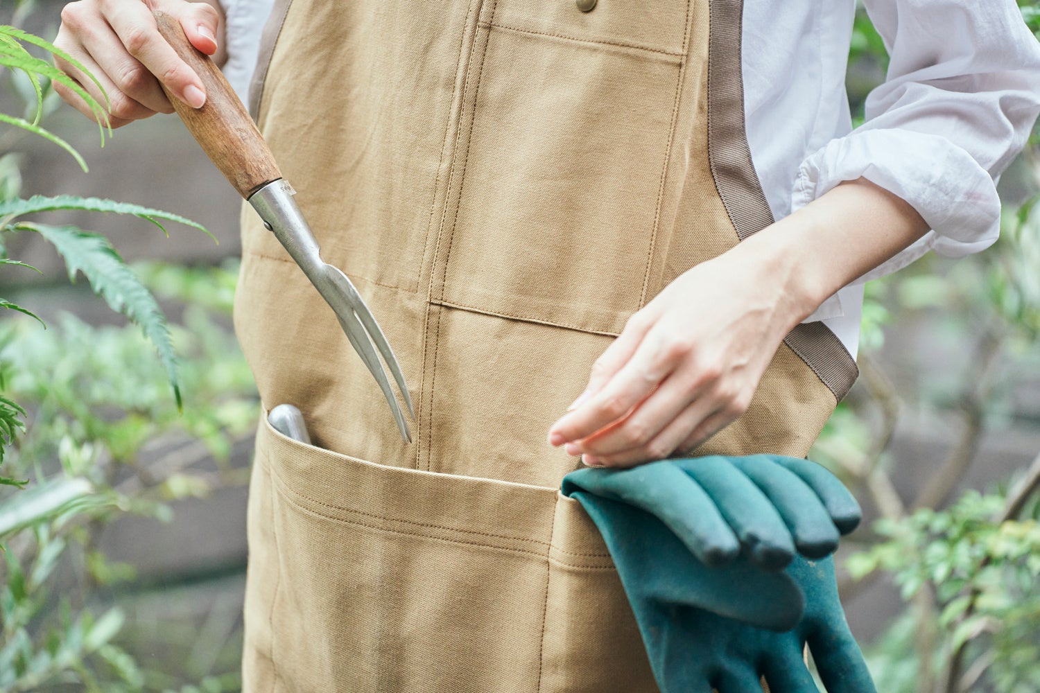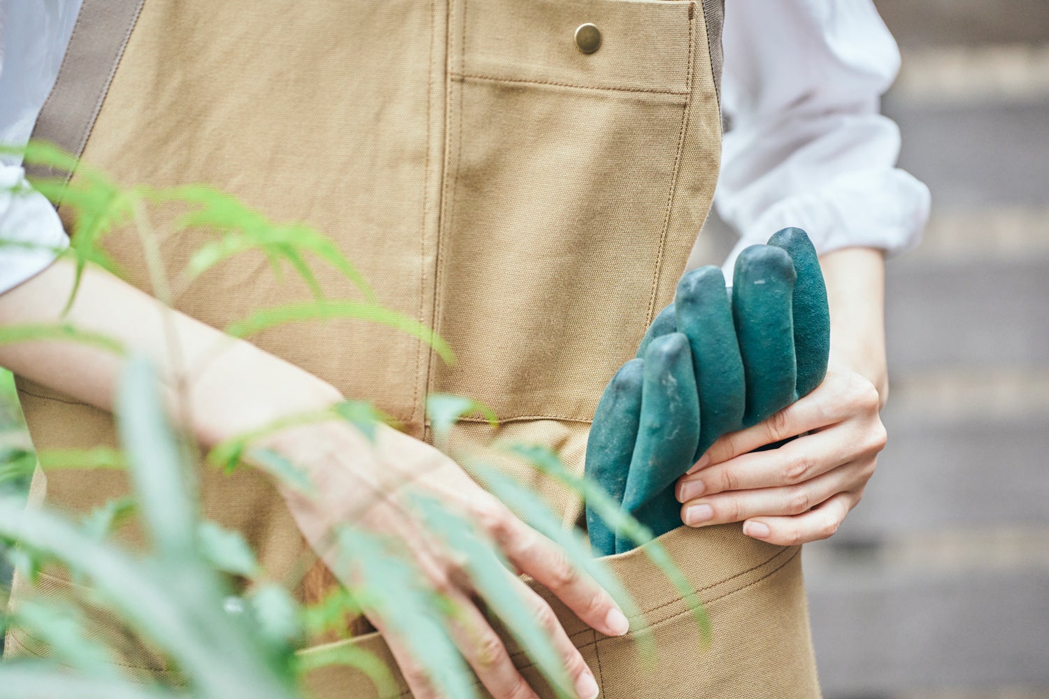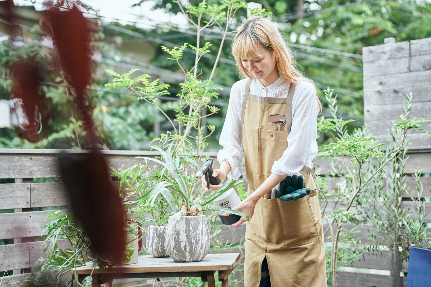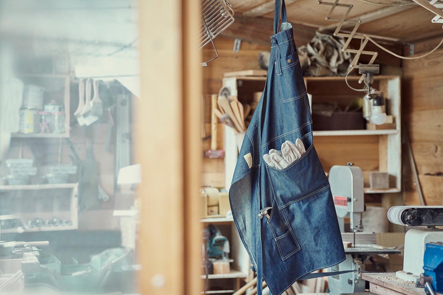 趣味でアウトドアを始めてみたり、家にいることが増えたから観葉植物を置いてみたり、エプロンは生活を豊かにするための相棒。硫化染めの生地が使われているので、使い込んで擦れていくさまが、ヴィンテージエプロンのようでさらに愛着が湧きそうです。