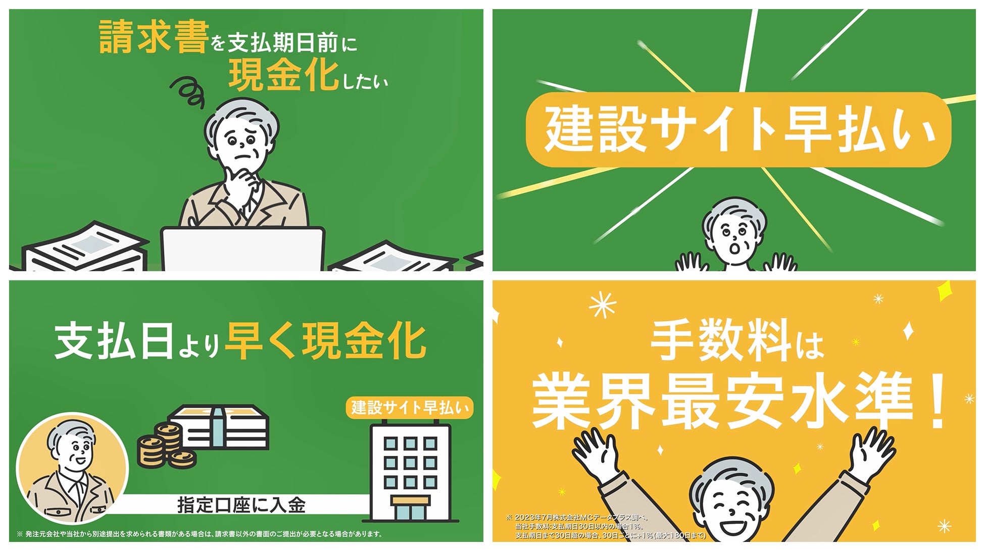 「建設サイト早払い」は、建設業における協力会社の請求書を買取ることで早期資金化を支援するサービスで、CMはサービスの特徴や利便性を訴求する内容となっています。
