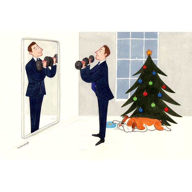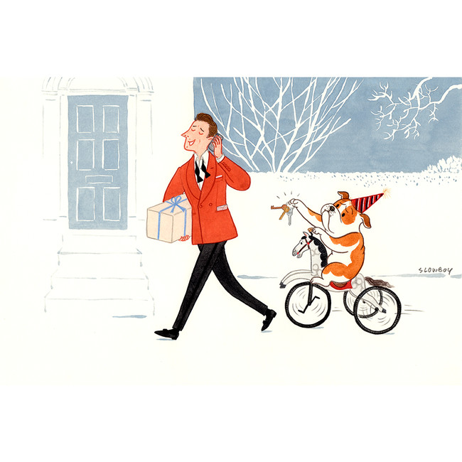 「Holiday Season」は主人公の男性とペットのブルドックが織りなす年末年始の楽しいひと時。オリジナルはダンヒルのために2016年に描かれたものです。